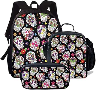 3D Sugar Skull Design Sac à Dos Adolescent Dames Casual Daypack Nouveauté 15 Pouces Cartables Sacs à Lunch Trousse à Crayons Elementary School Student Laptop Rucksack 3PCS