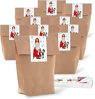 10 petites Marron Sac à fond de Croix Sacs Papier (14 x 22 x 5,6 cm) + 10 motifs Noël banderolen (5 x 15 cm) Père Noël avec Cadeau Enfant Père Noël Père Noël Sachet comme emballage de Noël